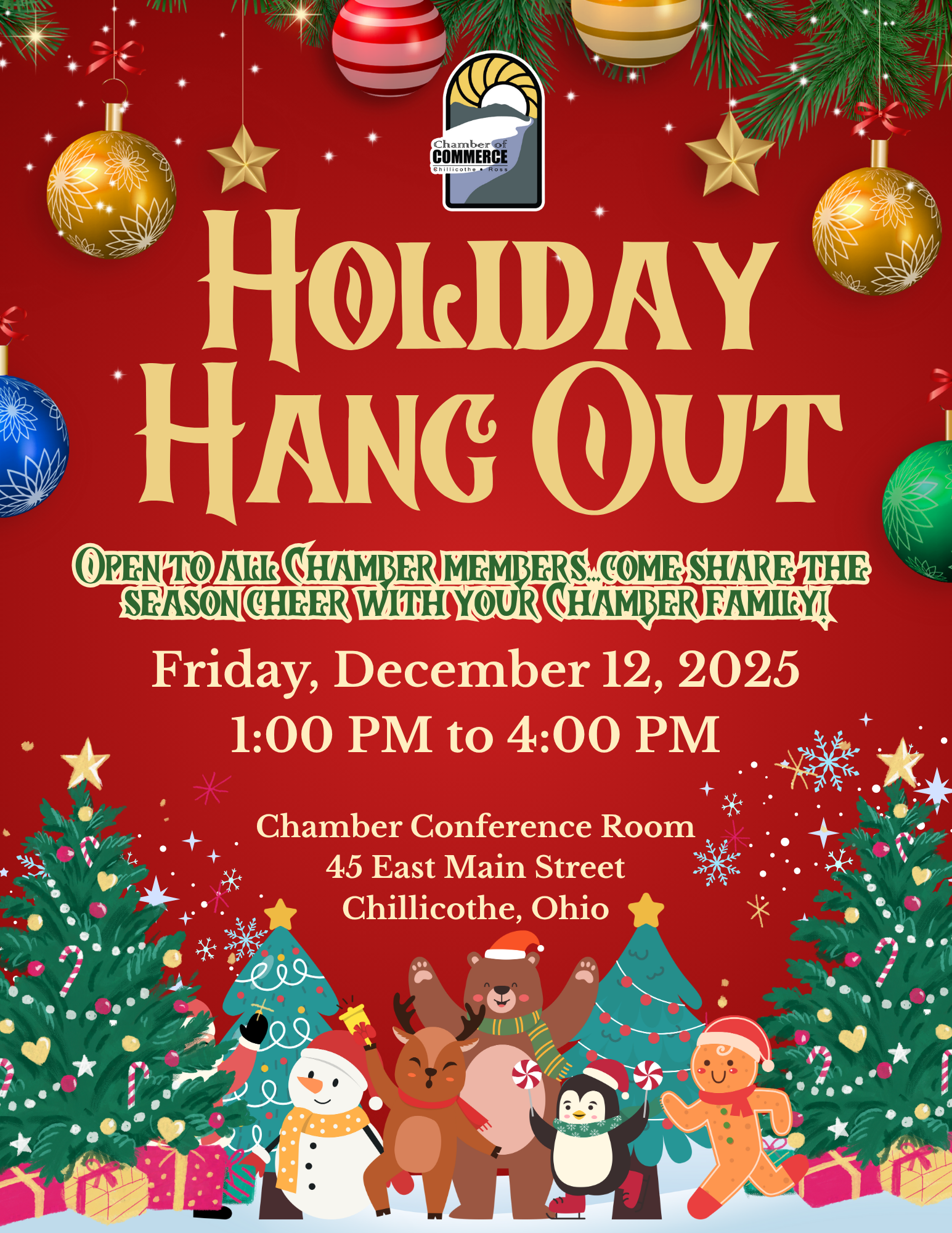 Get ready to mix, mingle, and jingle! 🎄✨ Join us for our first ever, Chamber Holiday Hang Out!! A festive open-house style celebration. Swing by anytime between 1:00 PM and 4:00 PM on Friday, December 12th...stay for a little or stay for a while.