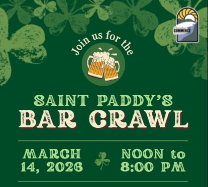 Grab your passport from the Chamber ahead of the event date or at Fifty West the day of the crawl and then begin at your bar of choice starting at 12pm. Each bar stop has its own hours but completed passports due back to The Chamber at 45 E. Main Street by12pm on 3/16/26.