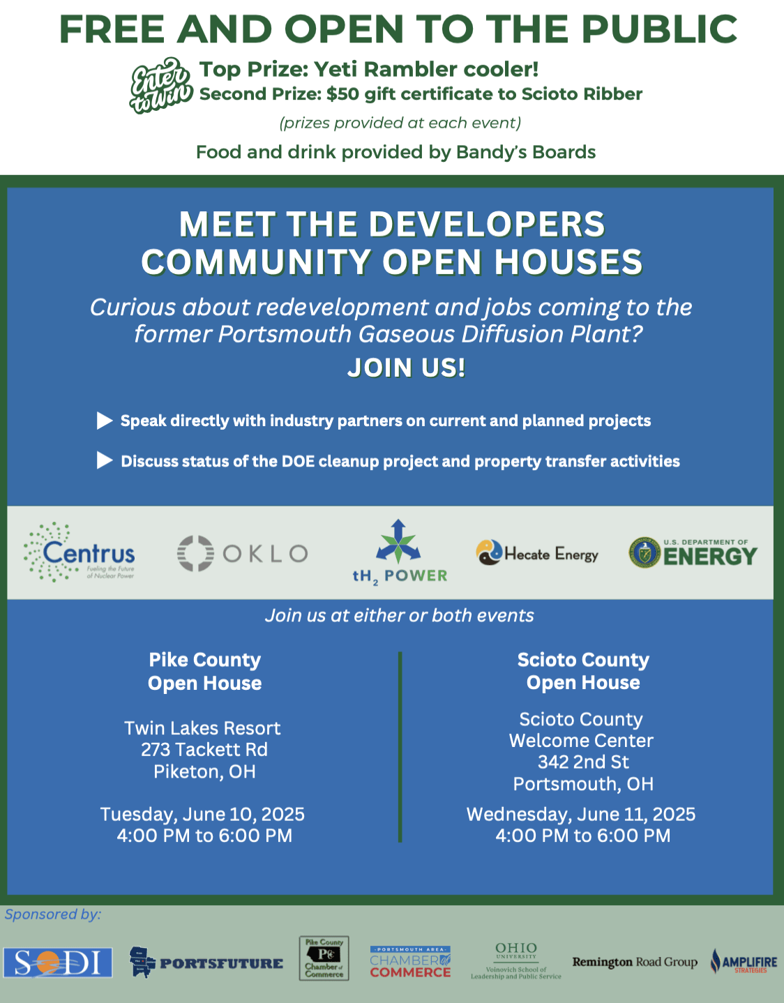 Suppose you're curious about redevelopment and job opportunities coming to the former Portsmouth Gaseous Diffusion Plant. In that case, you'll be interested in two upcoming open houses hosted by the Southern Ohio Diversification Initiative (SODI), featuring developers who are siting operations at PORTS. We hope you'll be able to attend the June 10th Open House at Twin Lakes Resort in Piketon and/or the June 11th Open House at the Welcome Center in Portsmouth. Both sessions will take place from 4 to 6 p.m. Developers will be on hand to share information and answer questions in an informal setting. There will also be food, drinks, and door prizes!