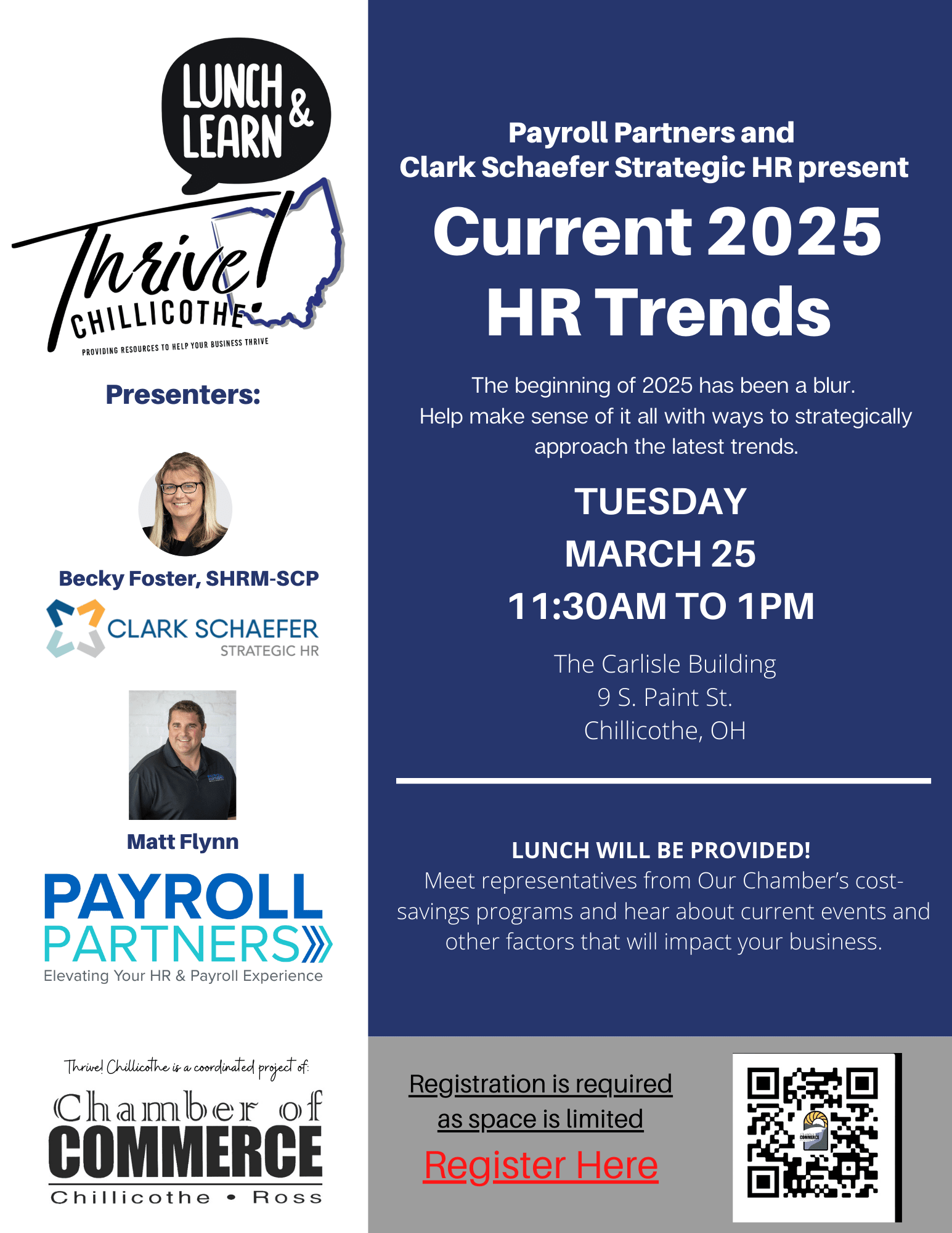 The start of 2025 has been a whirlwind—let’s make sure your business is ready to navigate the year ahead! Join the Chamber and our preferred partners, Payroll Partners and Clark Schaefer Strategic HR, for an insightful session on the latest HR trends and strategies to help your business thrive in '25!