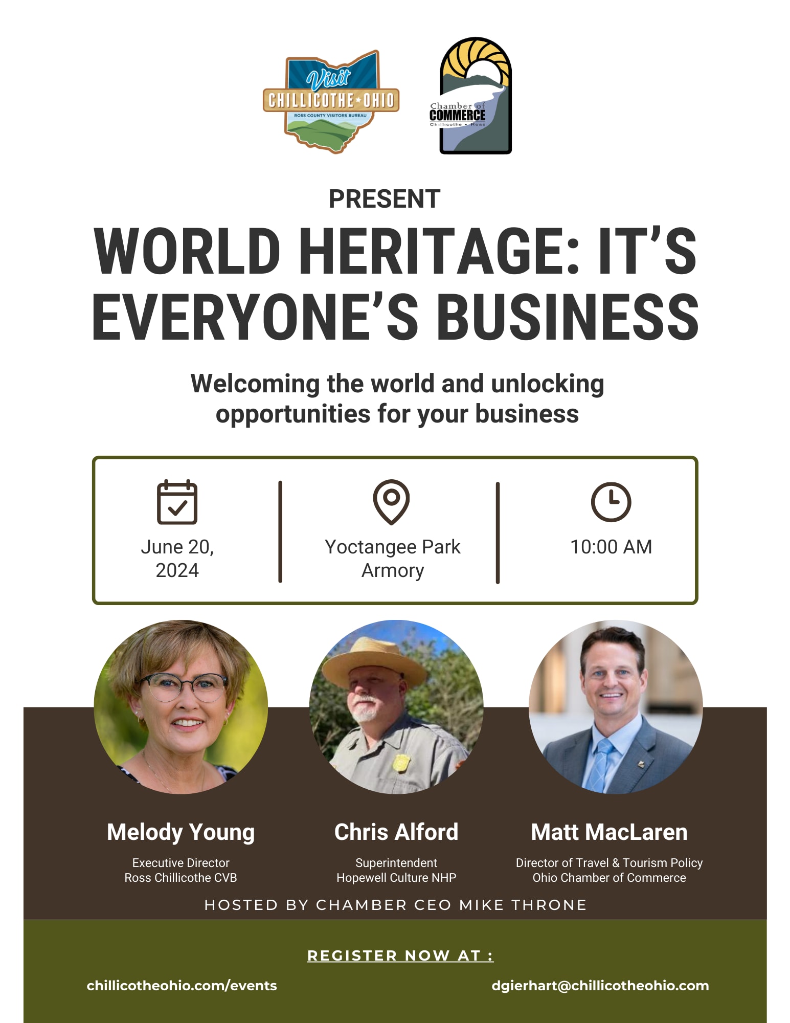 The Chamber and Ross Chillicothe Convention and Visitors Bureau will host “World Heritage: It’s Everyone’s Business” on Thursday, June 20, 2024 (the first day of summer), at the MAJESTIC THEATRE - UPDATED LOCATION DUE TO HEAT!!