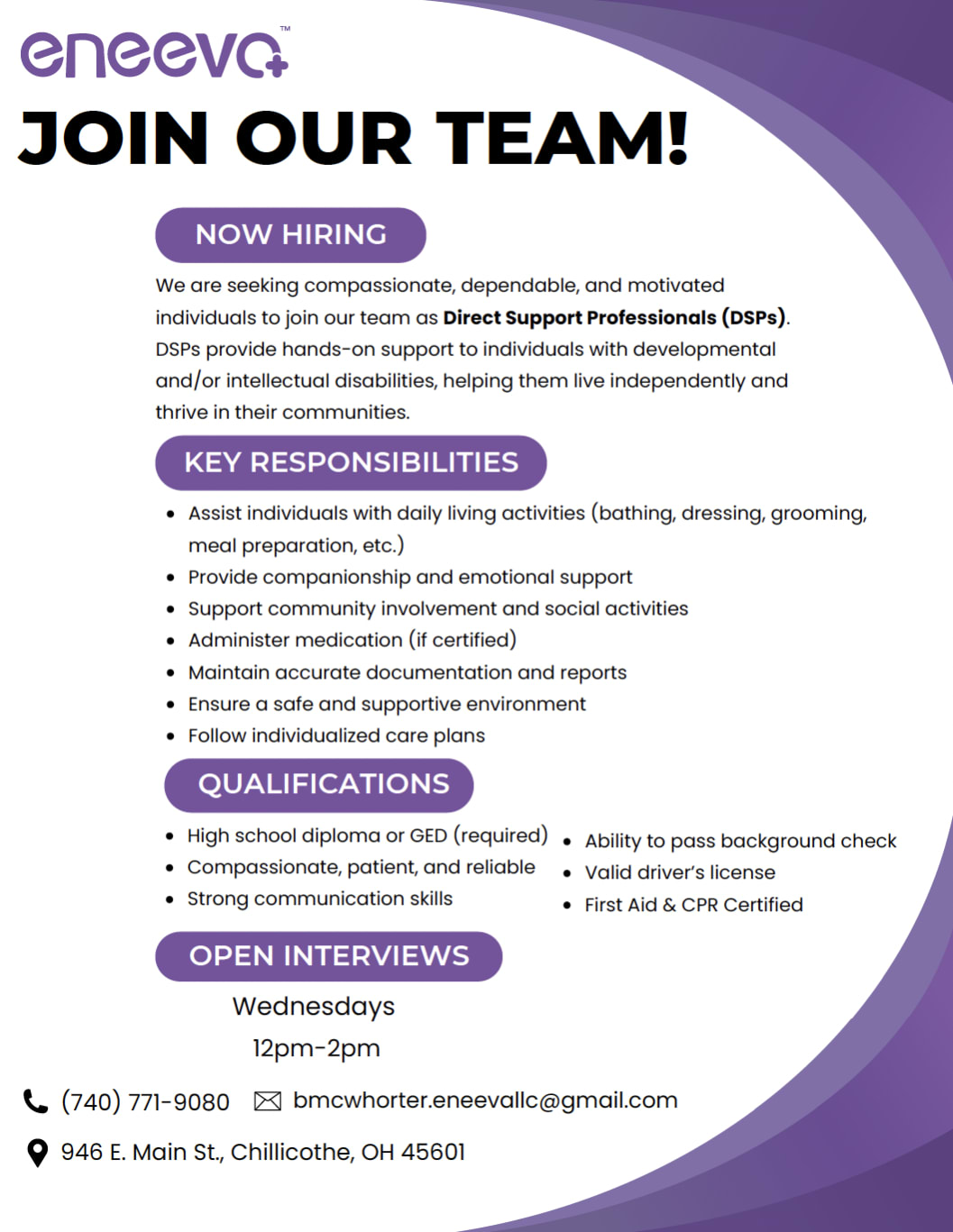 We are seeking compassionate, dependable, and motivated individuals to join our team as Direct Support Professionals (DSPs). DSPs provide hands-on support to individuals with developmental and/or intellectual disabilities, helping them live independently and thrive in their communities.