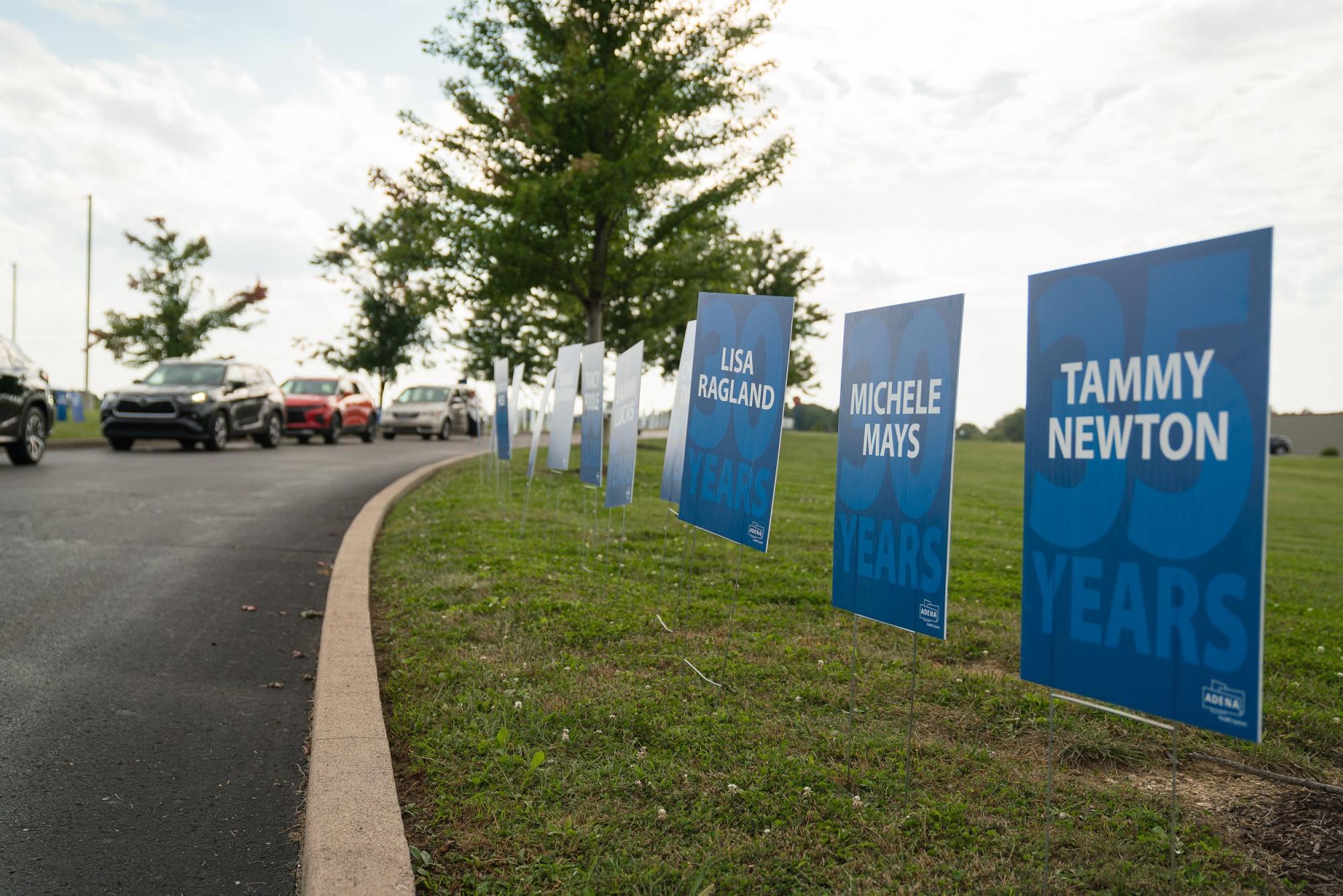 While not quite of the magnitude of the famous Hollywood Walk of Fame, the signs were a tribute to the more than 230 caregivers who have worked for the health system for 10 years or longer. Many of those caregivers – eight of whom have more than 40 years of service -- drove through that asphalt red carpet of sorts, soaking in the cheers of Adena’s executive team, receiving a meal and other gifts, and accepting heart-felt individual thank yous from leaders for the work they do every day.